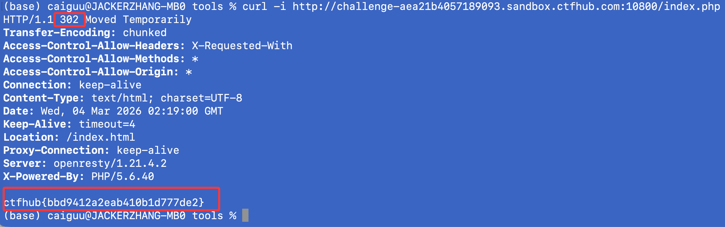 也就是说,标准的302响应信息不包括这个响应体,而是直接去告知浏览器做跳转,因此大家也都看不到这些包的内容,且浏览器也不会保留,F12也看不到。但是curl的话,这件事就会现原形了,所以我们就能得到藏在响应体里的flag。