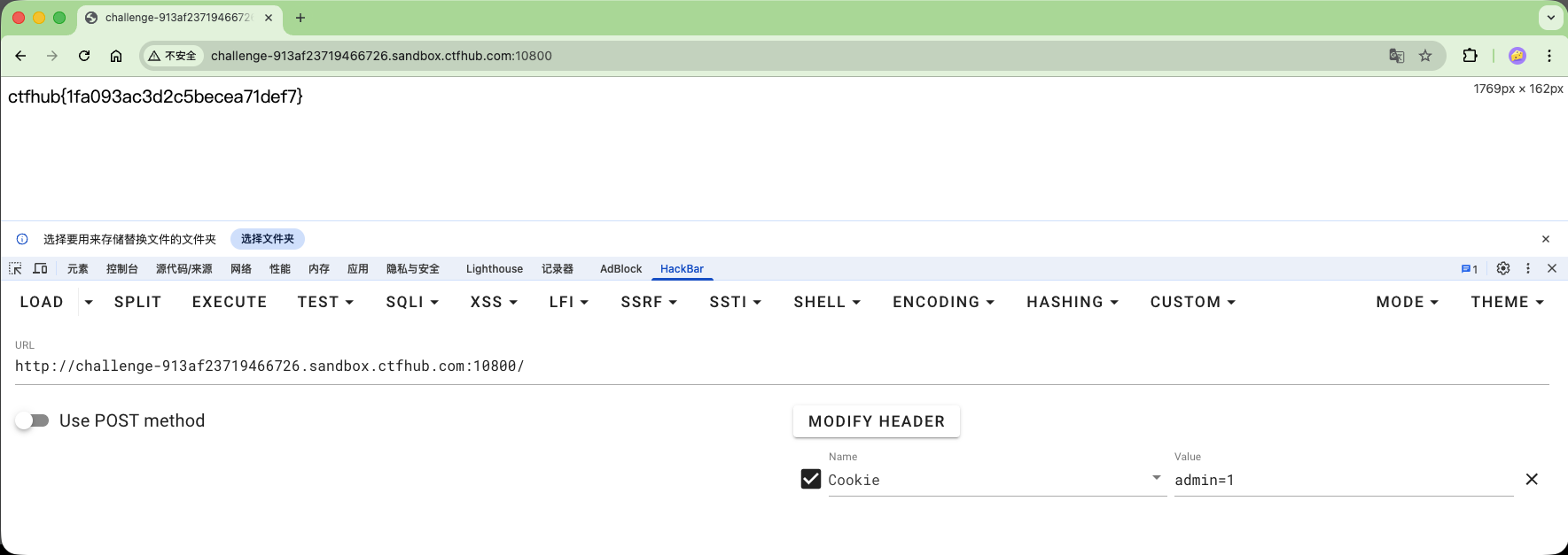 本题点开页面,提示“只有管理员才能访问”,然后F12看发送的请求,里面有一个Cookie选项,其中内容是admin=0。那我们发送一个Cookie内容为admin=1的包即可解开本题。