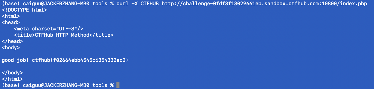 打开题目,显示的内容是需要使用CTFH**B方法进行请求页面,但是这个不好在HackBar或者POSTMAN里改。不过有一种办法,那就是用CURL命令。